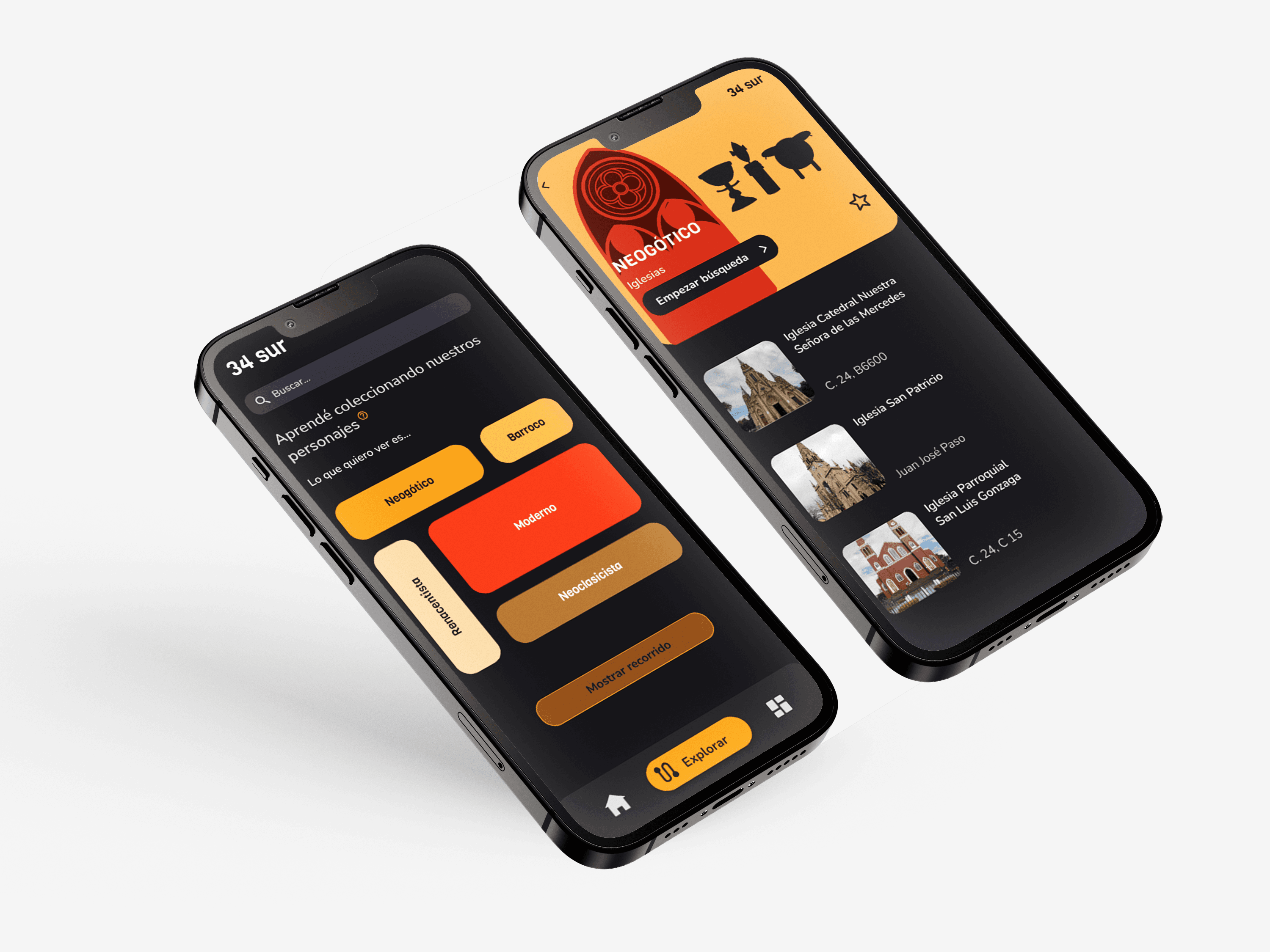La idea principal de 34 SUR es usar los estilos arquitectónicos que se encuentran en Mercedes y separarlos por categorías, y descubriendo más información de los edificios e iglesias a través de personajes nativos de la aplicación.