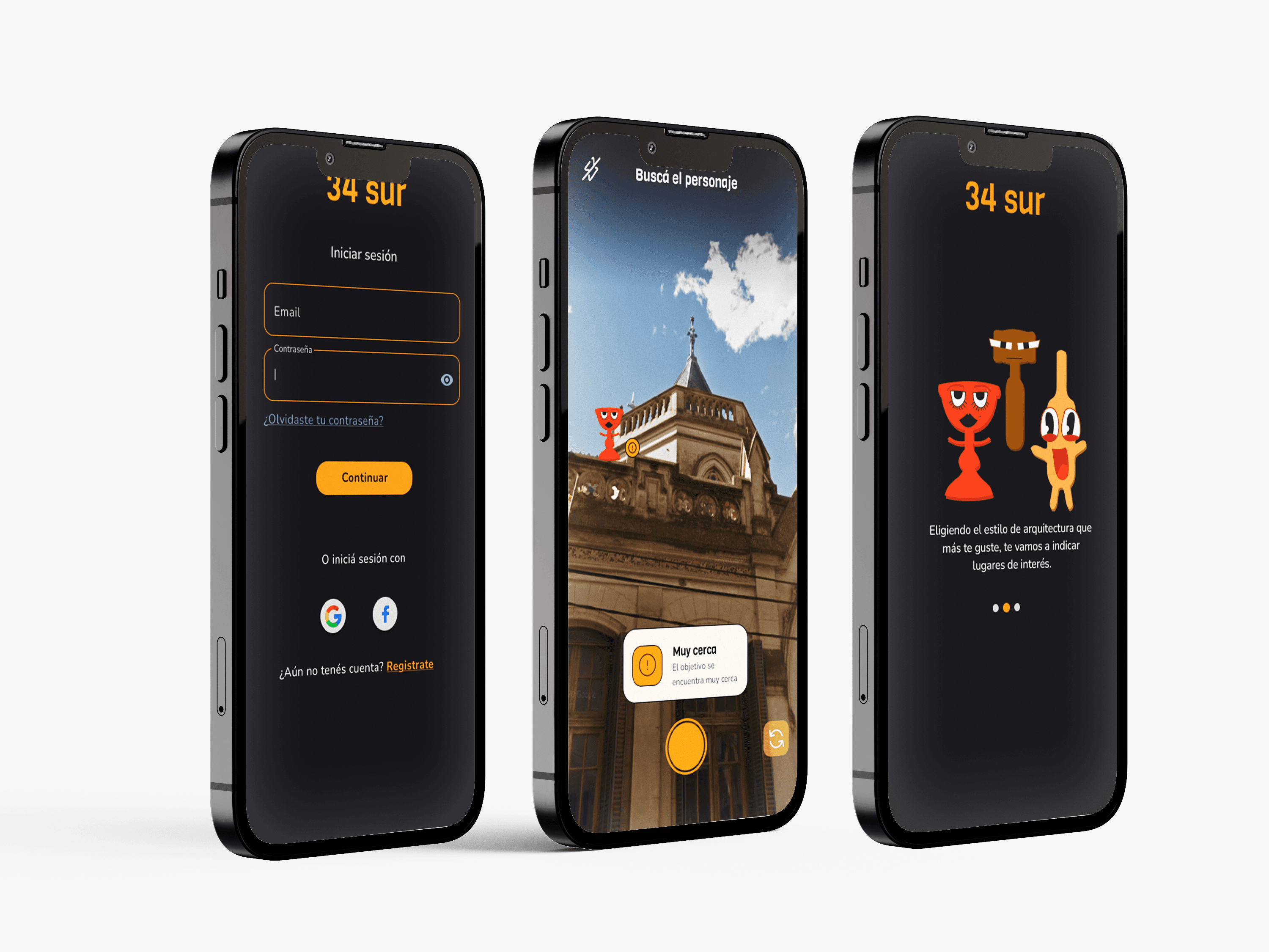 Para que el usuario pueda mantener el progreso de las colecciones y/o personajes, tendrá que iniciar sesión (o registrarse, sea le caso) y se le guardará en la nube de la aplicación. 34 sur va a ser usada como herramienta para recorrer la ciudad y saber más de la arquitectura e historia de las edificaciones tanto antiguas como modernas.